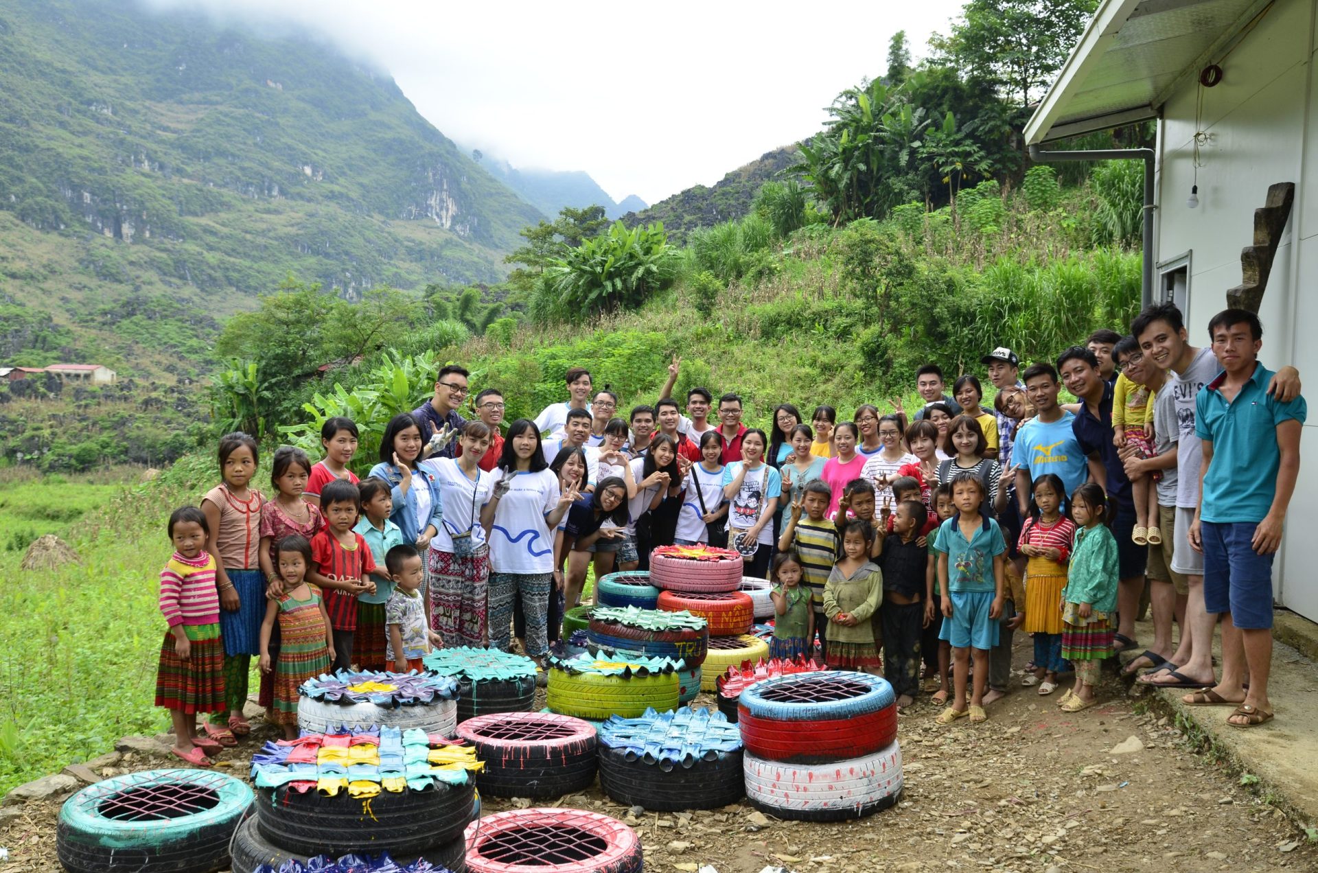 Con đường chúng tôi đến điểm trường dài 6 cây số, sỏi đá giăng đầy đường, chênh vênh, uốn lượn trên các quả đổi ở độ cao hơn 3000m. Vì địa hình trắc trở, lại thêm khối lượng đồ quyên góp khá nhiều, chúng tôi buộc phải sử dụng hình thức đi bộ để kịp đến trước 12h. Người dân trong bản đến gùi giúp chúng tôi bàn ghế, bảng, dụng cụ nhà bếp, chăn, quần áo ấm, sách vở… Chúng tôi ai nấy tròn mắt nhìn những người phụ nữ Mông mặc trên mình bộ váy hoa thêu sặc sỡ, cả những em gái chỉ đứng đến ngang vai mình gùi cả hai chiếc bàn học sinh sau lưng, chân đi thoăn thoắt, vượt qua những mỏm đá lồi lõm trên con đường đất ngoằn ngoèo. Còn chúng tôi, những thanh niên sức dài vai rộng, thở hổn hển không ra hơi, chia nhau xách mỗi người một ít đồ vừa đi vừa nghỉ, thoáng cái đã chỉ còn thấy bóng các chị, các em xa khuất sau những nương ngô.